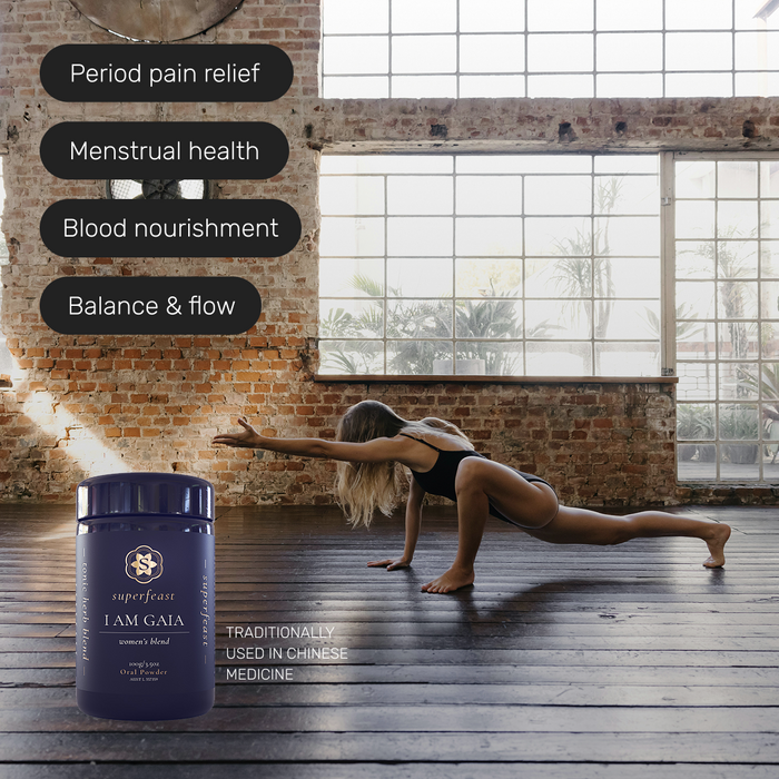 I Am Gaia is a deeply nourishing blend of 8 potent herbs designed to bring the feminine into balance, as nature (or Gaia!) intended. Its ingredients are traditionally used in Chinese medicine to support healthy menstrual cycles, relieve period pain, and replenish Blood.